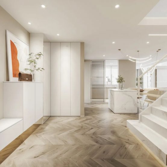 项目类型:极简奶油风复式,项目材料:小蓝鲸石晶—臻木系列橡木浅白油